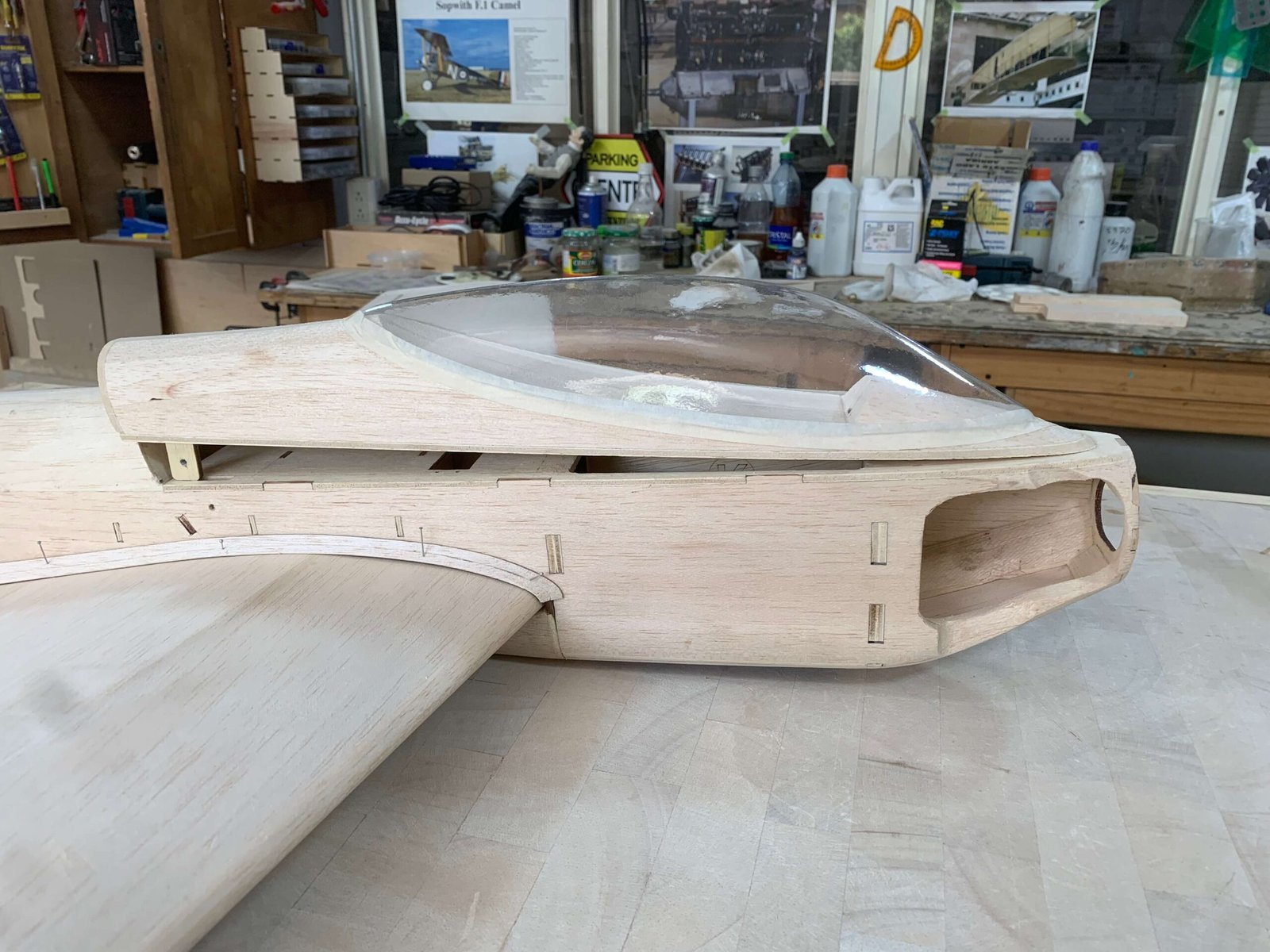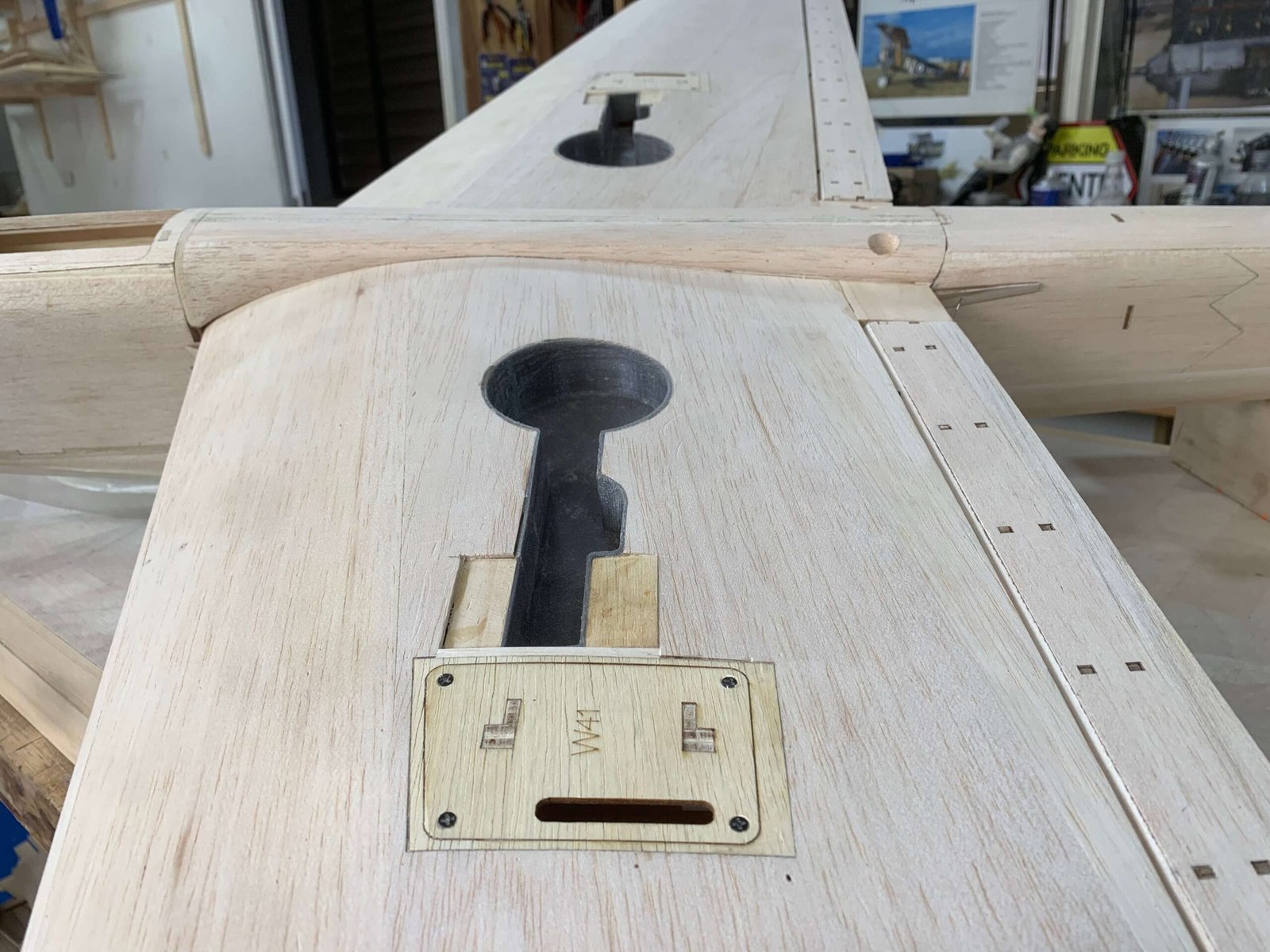 Cabina desmontable en la parte superior del fuselaje con acceso al interior del avión para ajustes del tanque de combustible, baterías de mando, potencia y RX.